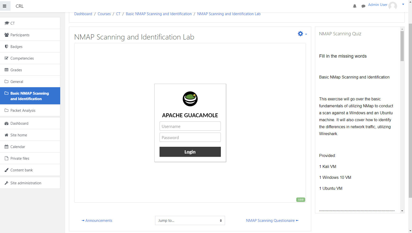 Login as a guest, and navigate to the Site Home. From there, click on Cyber Training under Available courses. You will see two courses, Basic NMAP Scanning and Identification, and Packet Analysis, each with their respective materials. Click on the NMAP Scanning and Identification Lab. This will direct you to our first assignment. As you will see, the lab consists of the actual VMs hosted on Azure, as well as a fill in the blank quiz on the right hand side. This specific interactive content will go over the basic fundamentals of utilizing NMap to conduct a scan against a Windows and an Ubuntu machine. It will also cover how to identify the differences in network traffic, utilizing Wireshark.